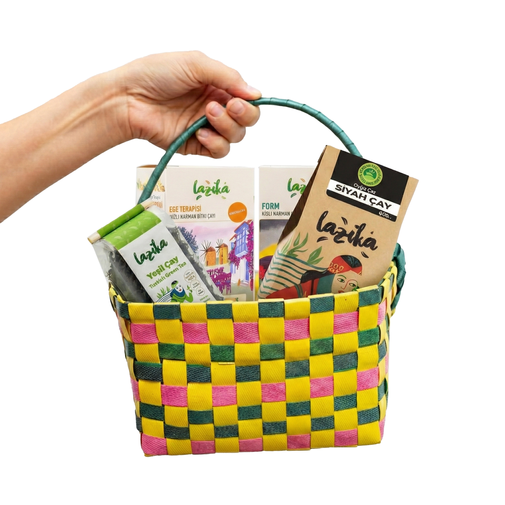 Lazika’nın geçmiş olsun çayları, şifa niyetine... El Yapımı Renkli Sepet içerisinde; Siyah Çay 400g, El Yapımı 50g Yeşil Çayımız, Hisli Harman çay serimizden Ege Terapisi ve Form çaylarımız var. Sepet Ölçüsü: (18x18x13) Not: Sepet renkleri değişiklik gösterebilir.