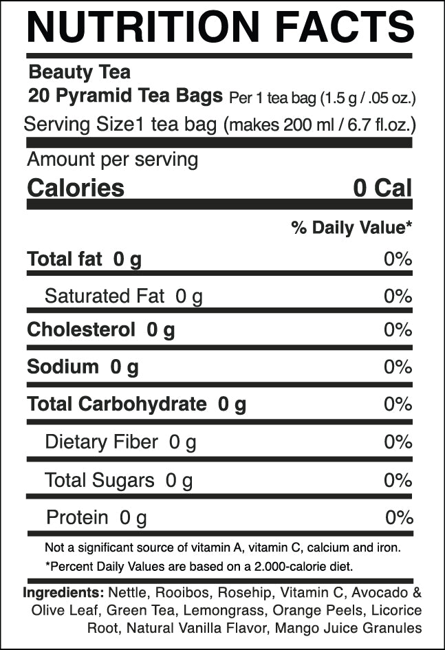 Yeşil Çay, Isırgan Otu, Rooibos, Meyan Kökü, Limon Otu, Avokado, Zeytin Yaprağı, Portakal Kabukları, C Vitamini, Mango Suyu Granülleri, Kuşburnu Meyvesi, Vanilya Aroması