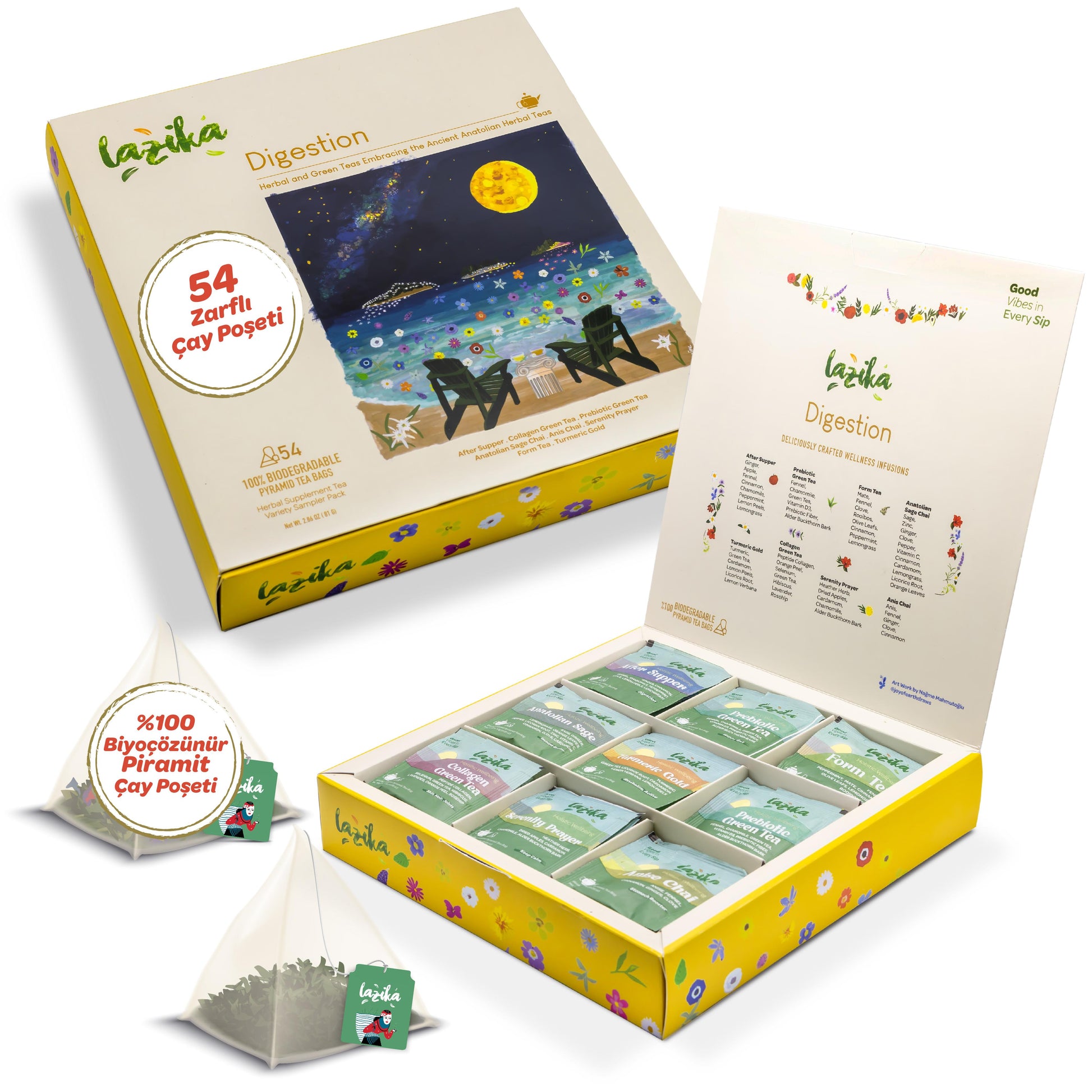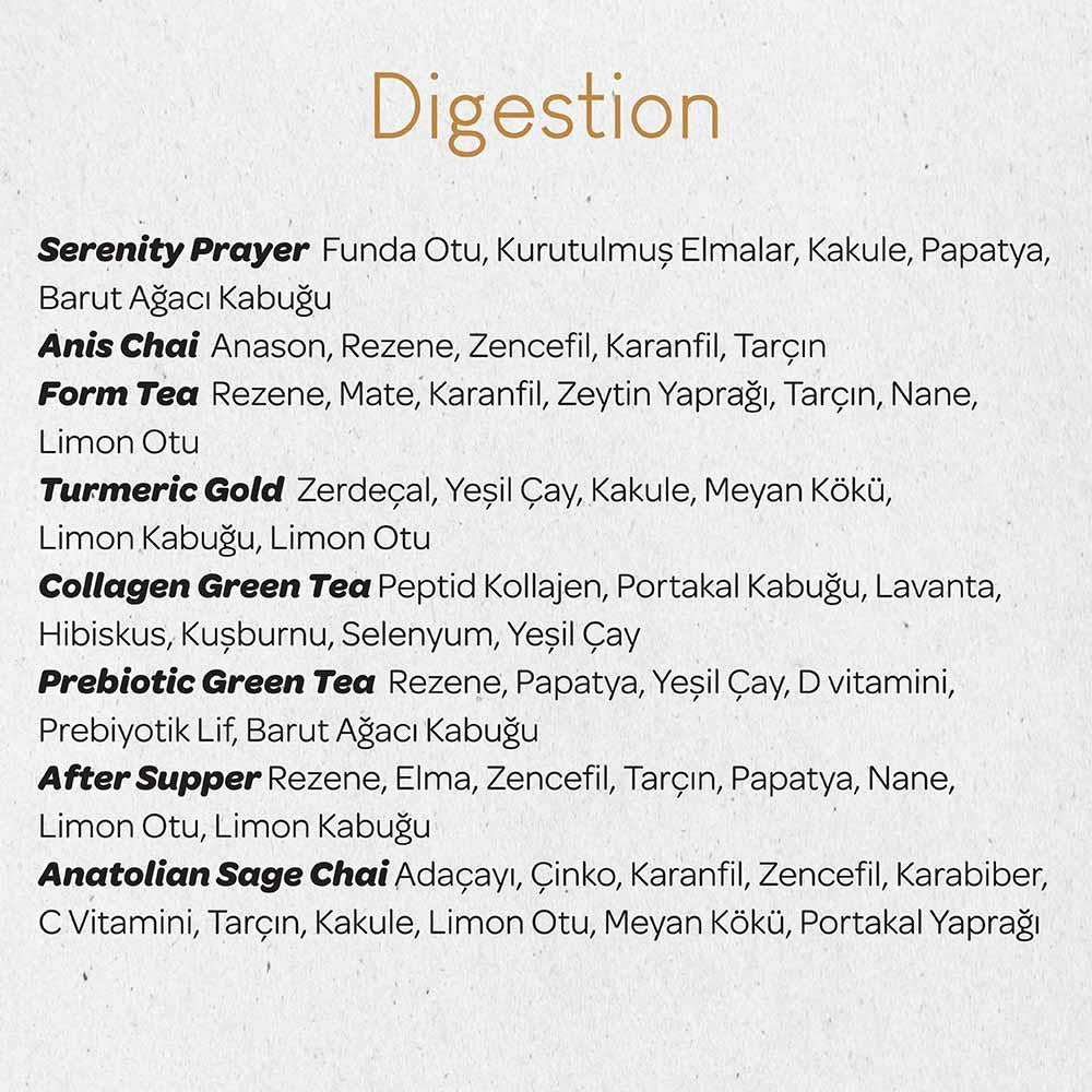 Sindirim sağlığınızı desteklemek için özenle hazırlanmış çay kutumuzla mutlaka tanışmalısınız! Anason ve Rezeneli harmanımız, Nane ve Rooibos ile etkili bir Form çayı harmanımız ve Zerdeçal ile yeşil çayı buluşturan Altın Zerdeçal gibi 8 fonksiyonel harmanı içeren bu özel kutu, sindirim sisteminizi rahatlatırken damak zevkinize de hitap eder. Zencefil ve nane içeren Yemek Sonrası harmanı ve Peptit kolajen, Bitkisel lifler ve hibiskus ile zenginleşmiş yeşil çaylı harmanlarla metabolizmanızın ihtiyac duydugu destegi sağlarken keyifli içimleri ile yoğun hayata bir mola vermiş olursunuz . Her biri doğada çözülür çay poşetimizi sindirim sağlığınıza katkıda bulunmak ve sizlere lezzetli bir deneyim sunmak için hazırladık. ❤️ İçindekiler: Yemek Sonrası çayı, Prebiyotik Yeşil çay, Kolajen Yeşil Çay, Anadolu Adaçayı, Sekine dinlenme çayı, Form çayı, Altın Zerdeçal