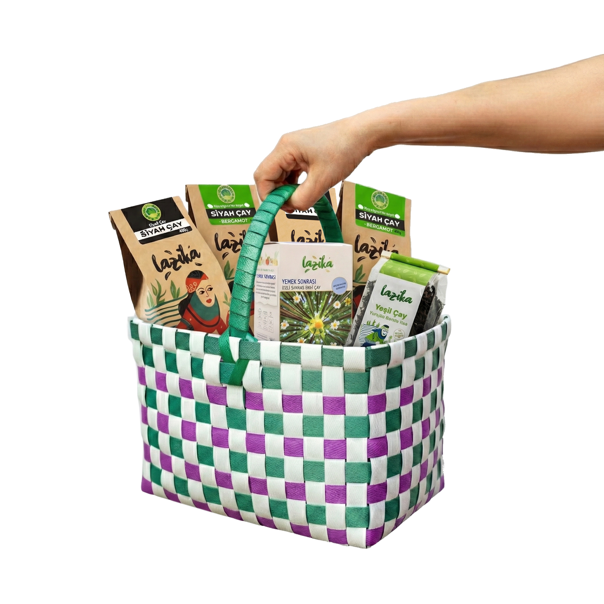 Bir sülaleye yetecek kadar siyah çay, tatlı niyetine de elma çayıyla… El Yapımı Renkli Sepet içerisinde; 2 paket Siyah Çay 400g, 2 paket Bergamotlu Siyah Çay 350g, El Yapımı 50g Yeşil Çayımız ve Hisli Harman Serimizden Yemek Sonrası çayımız var. Sepet Ölçüsü: (26x17x17) Not: Sepette değişiklikler yapılabilir.