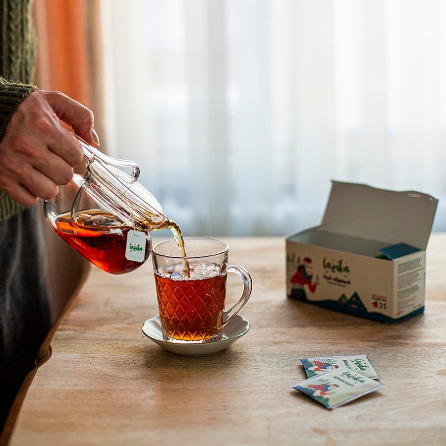 Good tea is always with you, no matter what. All you need is hot water. The only difference with our tea bag is that it contains finer black tea. Other than that, it's your familiar Lazika Black Tea. Free from tea extract, artificial flavors, or imported tea, it delivers a pure and delicious taste in unbleached tea bags.