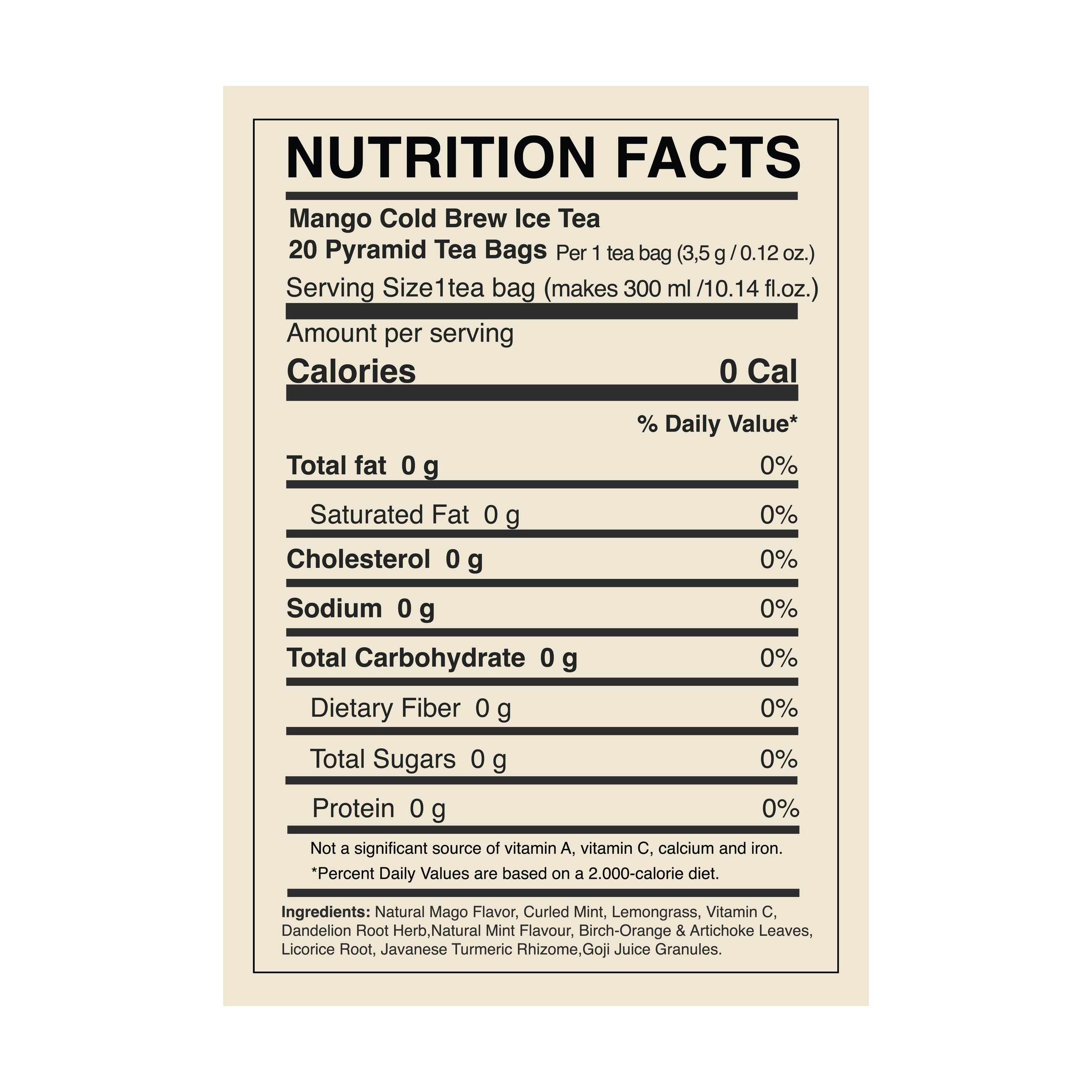 Kıvırcık nane, meyan kökü, huş yaprağı, limon otu, karahindiba, enginar yaprağı, goji meyvesi, Java zerdeçalı, C vitamini ve doğal mango aromasıyla hazırlanan bu ferahlatıcı bitki çayı, şeker ilavesizdir.